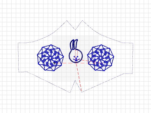This pattern gives a template within which you can create a design. When stitched the template can be sewn into a mask. The v shape at the top and bottom should be sewn closed to form the nose and chin cups. The two rectanglar flaps at the left and right edges are folded back and sewn top to bottom leaving a tunnel through which elastic or ribbon can be threaded and tied to make loops for the ears. Big embroidery hoop needed for this one