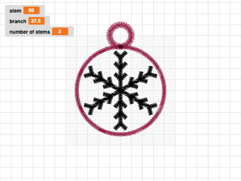 This is the sketch pad version of a very simple stellar snowflake done on white felt. It was a first pass at defining a stellar dendrite snowflake. It has problems: (1) backtracking in satin stitch is a waste, better to go out to the edges in running stitch and return with satin which is a technique called underlaying in professional machine embroidery. (2) The branches are too short and (3) playing with (parameterizing) the angles might help. (4) When cutting, need to take care that the satin stitch around the edges isn't cut into. (5) The loop at the top is too big. Next step is to turn it into reusable blocks and set up to pass any branch pattern into a snowflake.